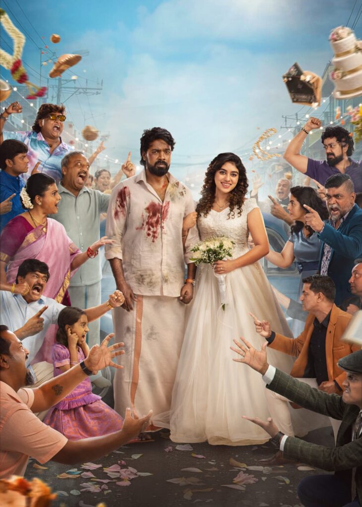 படத்தின் ஃபர்ஸ்ட் லுக், முதல் பார்வையிலேயே கவனத்தை ஈர்க்கும் வகையில் வடிவமைக்கப்பட்டுள்ளது. நடுவில், ரத்தக் கறைகள் படிந்த உடையுடன் மணமகன் கோலத்தில் நிற்கும் பாரி இளவழகன், அதற்கு நேரெதிராக வெள்ளை உடையில் கையில் மலர்க்கொத்து ஏந்தி புன்னகையுடன் மணகமகள்  கோலத்தில் நிற்கும் ரம்யா ரங்கநாதன்,  என இருவரும் கல்யாண கோலத்தில் இருக்க, அவர்களைச்  சுற்றியுள்ள கதாபாத்திரங்கள் காட்டும் பலவிதமான முக பாவனைகள், பறக்கும் பல பொருட்கள் என எல்லாம் இணைந்து, இப்படம் அனைத்து தரப்பு ரசிகர்களையும் கவரும் ஜாலியான ஃபேமிலி என்டர்டெயினர் என்பதை உறுதி செய்கின்றன.