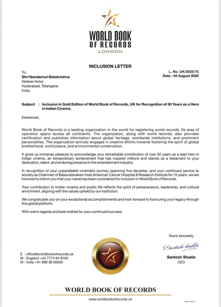 In a formal commendation issued by Santosh Shukla, CEO of the World Book of Records, Balakrishna’s five-decade-long contribution to cinema has been hailed as an inspiration to millions—a legacy that has set a golden benchmark in Indian cinema and beyond. His ability to constantly reinvent himself while staying deeply rooted in tradition reflects not just the journey of an acclaimed actor but that of a cultural torchbearer who bridges generations.