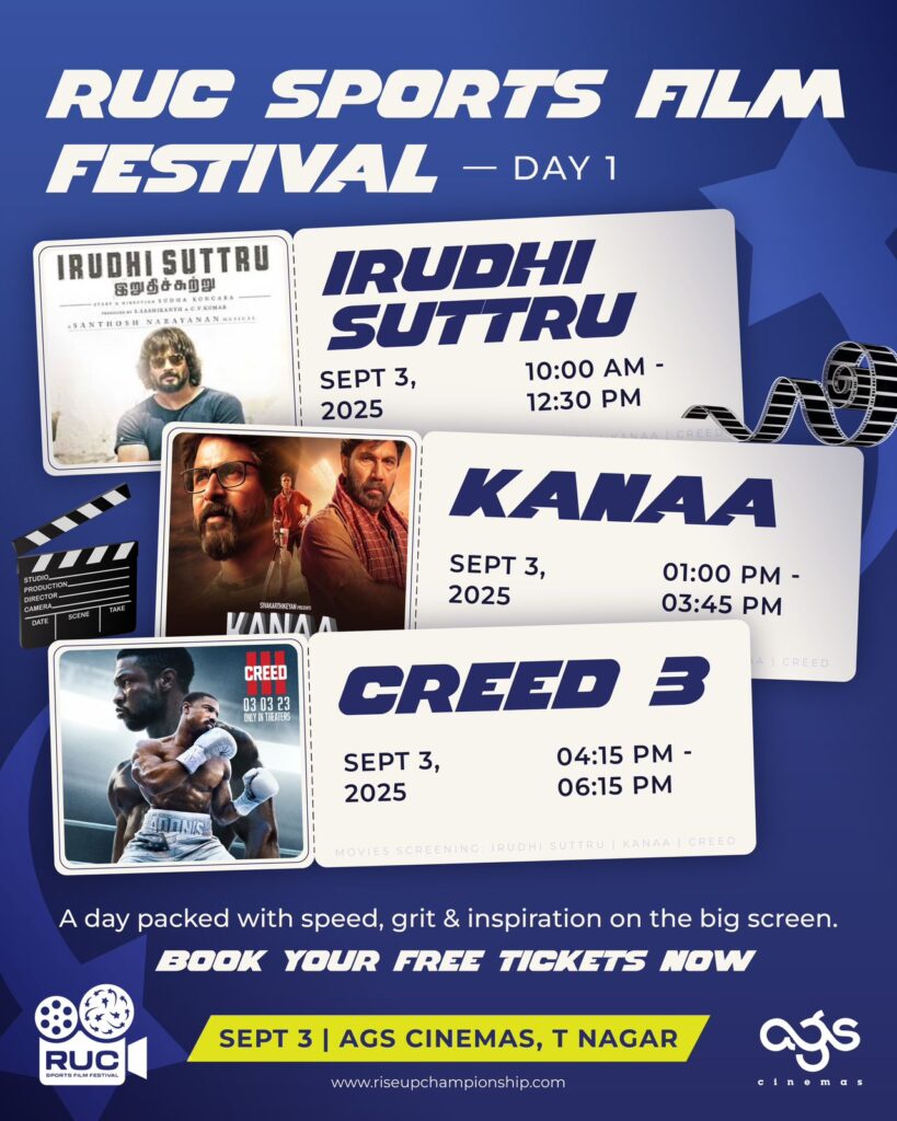 விளையாட்டு மற்றும் சினிமாவின் தனித்துவ கொண்டாட்டமான RUC ஸ்போர்ட்ஸ் ஃபிலிம் ஃபெஸ்டிவல் செப்டெம்பர் 3 மற்றும் 4 அன்று சென்னை, தி.நகரில் உள்ள AGS சினிமாஸில் அறிமுகமாகிறது. காலை 9 மணி முதல் மாலை 6 மணி வரை ஆங்கிலம், இந்தி மற்றும் தமிழ் மொழிகளில் பிளாக்பஸ்டர் மற்றும் விமர்சன ரீதியாக பாராட்டப்பட்ட தேர்ந்தெடுக்கப்பட்ட படங்களை இரண்டு நாட்களுக்கு பெரிய திரையில் பார்த்து கொண்டாடலாம்.